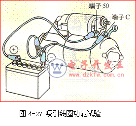 將起動機勵磁線圈的引線斷開,按圖4-27所示連接蓄電池與電磁開關。