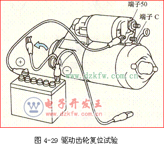 首先將起動機固定好,再按圖4-31所示連接導線,起動機運轉應平穩,同時驅動齒輪應移出。讀取安培表的數值,應符合標準值。斷開端子50后,起動機應立即停止轉動,同時驅動齒輪縮回。
