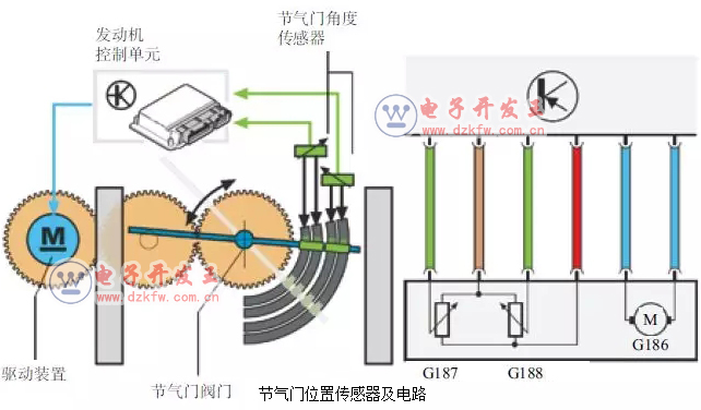 如下圖所示,節(jié)氣門位置傳感器安裝在發(fā)動(dòng)機(jī)節(jié)氣門體上,并與節(jié)氣門閥門聯(lián)動(dòng),是由駕駛員通過(guò)加速踏板來(lái)控制的。其作用是測(cè)量發(fā)動(dòng)機(jī)節(jié)氣門的開度,使控制單元了解發(fā)動(dòng)機(jī)負(fù)荷,以此作為自動(dòng)變速器換擋的一個(gè)重要依據(jù)。