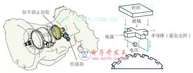 當(dāng)霍爾元件中有電流經(jīng)過(guò)并有磁場(chǎng)垂直施加于此元件時(shí),將產(chǎn)生一分別垂直于磁場(chǎng)和電流且與電流和磁場(chǎng)強(qiáng)度成正比的電壓,這些電壓信號(hào)就是輸出軸轉(zhuǎn)速傳感器脈沖信號(hào)。