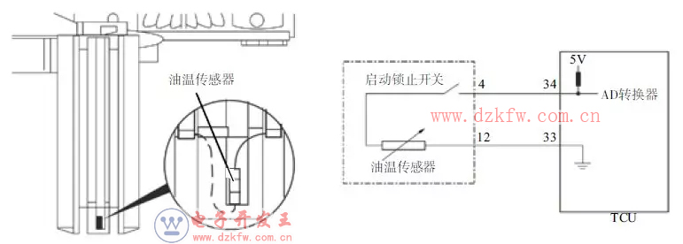 自動(dòng)變速器油溫度傳感器為一具有負(fù)溫度系數(shù)特性的熱敏電阻,溫度越高時(shí),電阻越小。TCM就是根據(jù)其電阻的變化算出自動(dòng)變速器油液溫度的。當(dāng)ATF溫度為10℃時(shí),油溫傳感器的電阻為5.8~7.0kΩ。當(dāng)ATF溫度為110℃時(shí),油溫傳感器的電阻為0.23~0.26kΩ。