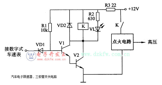 當(dāng)數(shù)字式車速表顯示 "80"時,表明車速已達(dá)到8Okm/h,此時譯碼驅(qū)動器的D輸入端變?yōu)楦唠娖剑筕l和V2飽和導(dǎo)通,K通電吸合,其常閉觸頭斷開,點火電路停止工作;同時VL發(fā)光,提醒駕駛員車速超限。