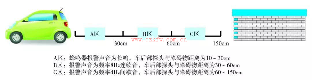 當(dāng)車輛掛到倒車擋時,倒車?yán)走_(dá)ECU使用超聲波傳感器監(jiān)控后保險桿周圍的區(qū)域,如果監(jiān)控區(qū)域內(nèi)檢測到物體,儀表組件內(nèi)的聲音報警裝置就會發(fā)出聲音警告。系統(tǒng)能夠探測到比較堅硬的固體障礙物同時也能探測到鐵絲網(wǎng)和柵欄之類的物體。