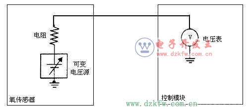 氧傳感器電路包括控制模塊、氧傳感器、連接器和引線。傳感器由串聯在一起的可變電壓源和電阻構成。電壓源向控制模塊產生零至某電壓之間的模擬電壓信號。電阻的作用是在傳感器與控制模塊間發生對地短路時,防止傳感器過載。