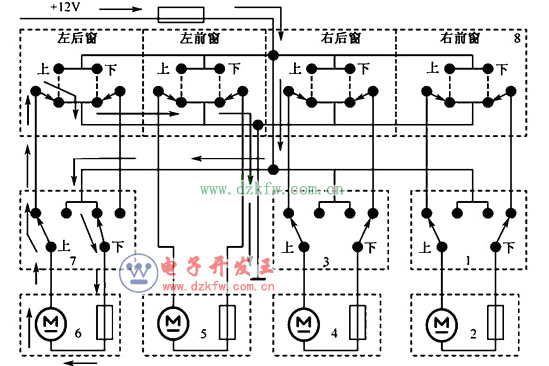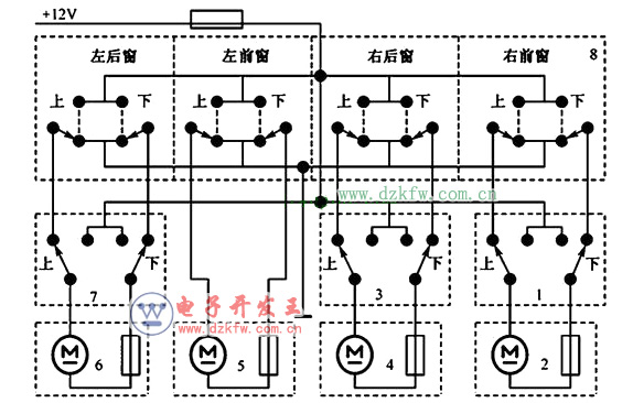 1-右前車窗開關 2-右前車窗電動機 3-右后車窗開關 4-右后車窗電動機 5-左前車窗電動機 6-左后車窗電動機 7-左后車窗開關 8-駕駛員主控開關組件