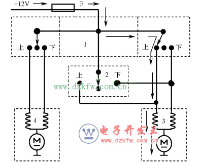 (1)駕駛員主控開關控制右前車窗上升。電流方向如圖所示箭頭所指。