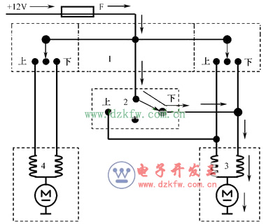 雙繞組串激型直流電動機有兩個繞向相反的磁場繞組,一個稱為“上升”繞組,一個稱為“下降”繞組。在給不同繞組通電時,會產生相反方向的磁場,電動機的旋轉方向也就不同,從而實現車窗的上升與下降。其控制電路見圖1-8。