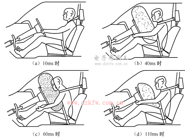 汽車撞車,達(dá)到氣囊系統(tǒng)引爆極限,傳感器從測出碰撞到接通電流需10 ms,引爆器點(diǎn)燃?xì)饽业臍怏w發(fā)生器,而此時駕駛員仍然處于直坐狀態(tài)。