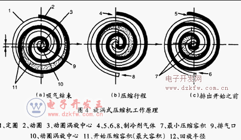 互錯開180度的渦旋葉片圈組合一對嚙合,動圈2以回旋半徑的圓作不旋轉的回運動。如(A)所示,在吸氣完了時,一對渦旋圈共形成兩對月牙形容積。最大的月牙容積11即將開始壓縮。動圈渦旋中心繞定圈渦旋中心連續公轉,原最大的月牙容積實現a—b—c的壓縮,達到預定壓力,由排氣口9排出。在月牙11壓縮的同時,在動圈和定圈的外周義形成吸氣容積4、8,連續回轉運動過程中,也實現了相同的壓縮,如此周而復始完成吸氣、壓縮、排氣過程。