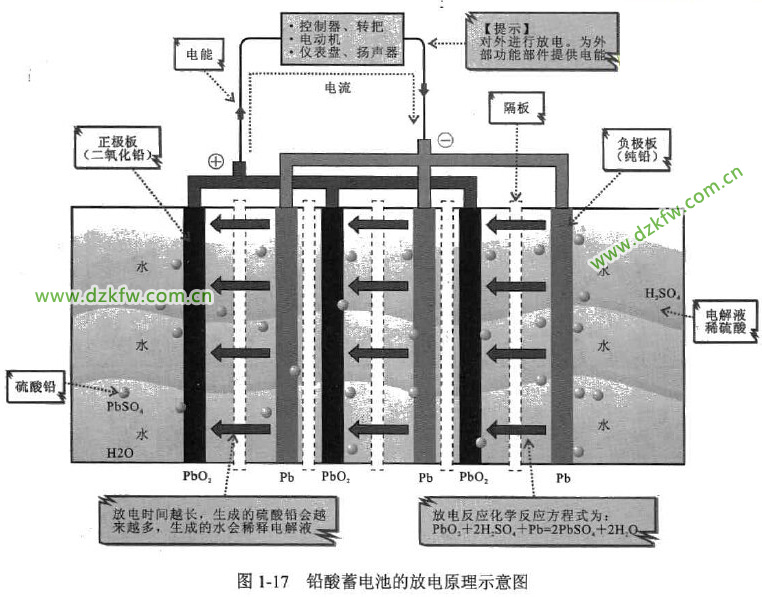 當蓄電池外接連接線路進行放電時,在電流的作用下,電解液內(nèi)部處于電離狀態(tài),正極板上的二氧化鉛與負極板上的純鉛就與電解液中的硫酸起了化學反應,從而生成硫酸鉛和水,化學方程式為: