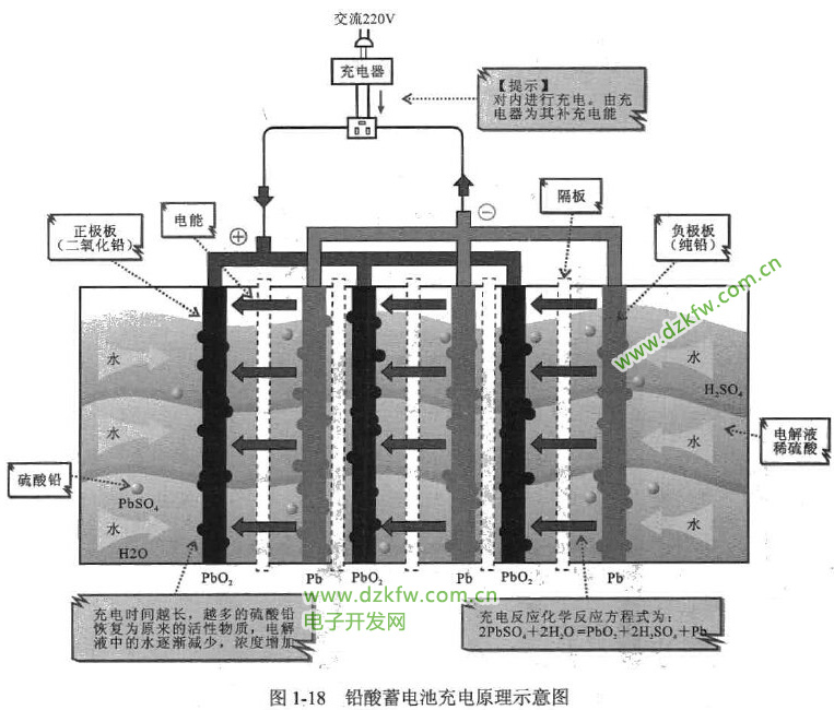 鉛酸蓄電池充電的過程正好與放電過程相反,也就是將電能轉(zhuǎn)化為化學能的過程,圖 1-18所示為鉛酸蓄電池充電原理示意圖。