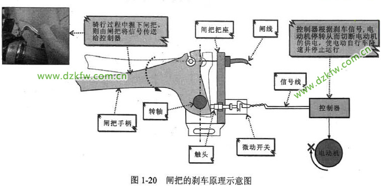 當電動自行車在正常行駛過程中,握住閘把,其手柄位置產(chǎn)生變化,使微動開關觸頭被彈起,之后由微動開關觸頭產(chǎn)生將向控制器發(fā)出的剎車控制信號,控制器接收到該信號后,將停止對電動機的供電,從而電動機停止轉(zhuǎn)動,實現(xiàn)剎車功能;同時,閘把圍繞轉(zhuǎn)軸轉(zhuǎn)動,閘線拉動車閘動作,實現(xiàn)機械制動。資料鏈接