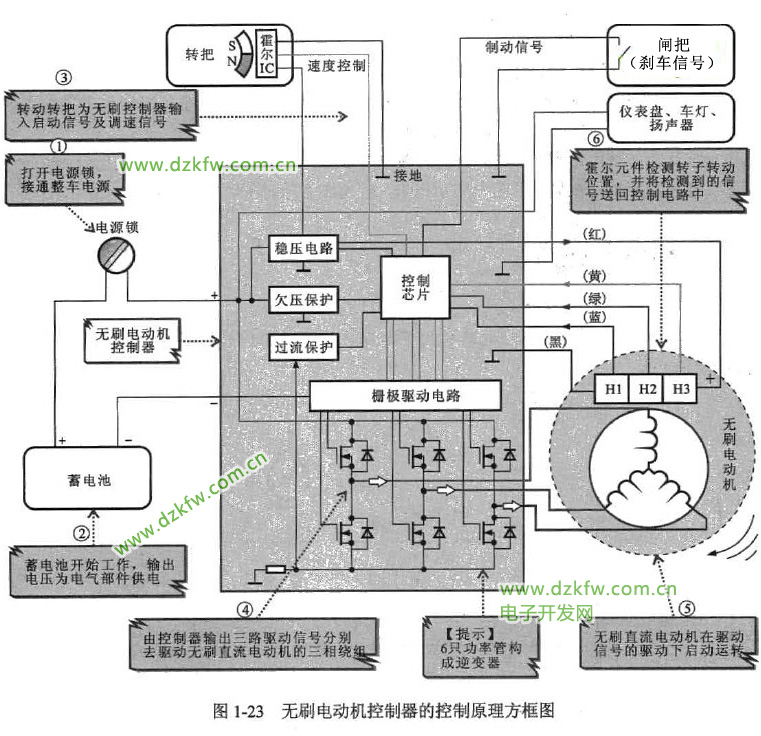 當旋動轉(zhuǎn)把時,調(diào)速信號通過引線送往控制器中的控制芯片中。控制器中的控制芯片根據(jù)接收到的信號作出相應的反應,并將控制信號和驅(qū)動信號送到邏輯電路和功率晶體管中,再輸出給電動機控制信號和驅(qū)動信號,使無刷電動機運轉(zhuǎn)。