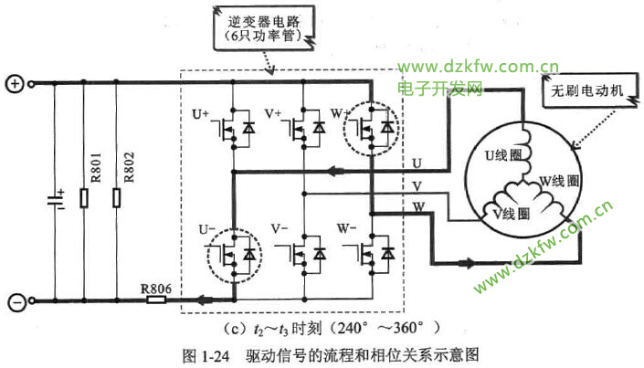 在t1~t2時刻(120°~ 240°):功率管V+和w-導通時,其他功率管截止,信號流程為:電源電流經(jīng)正端→功率管V+→V線圈→W線圈→功率管W-→R806→負端或到地.