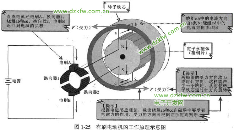有刷電動機中,一個線圈邊從一個磁極范圍經(jīng)過中性面到了相鄰的異性磁極范圍時,通過線圈的電流方向已改變二次,因而轉(zhuǎn)子的轉(zhuǎn)動方向保持不變。改變線圈中電流方向是靠挨向器和電刷來完成的。