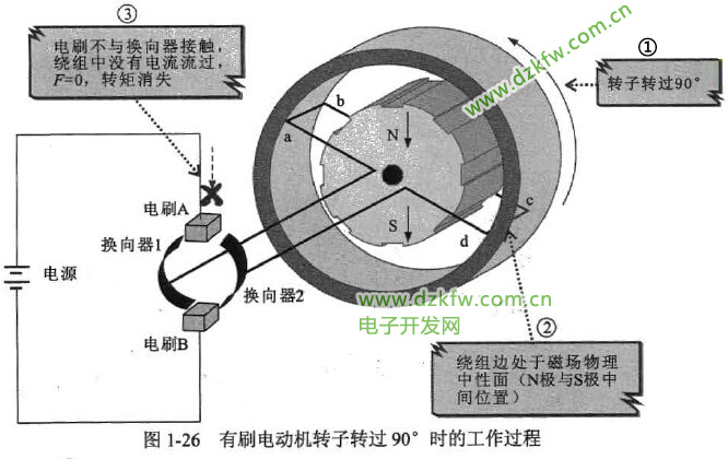 圖1-26所示為有刷電動機轉(zhuǎn)予轉(zhuǎn)過90°時的工作過程。當有刷電動機轉(zhuǎn)子轉(zhuǎn)過90° 時,兩個繞組邊處于磁場物理中性面,且電刷不與換向器接觸,繞組中沒有電流流過,F(xiàn)=0,轉(zhuǎn)矩消失。由于慣性的作用轉(zhuǎn)子會繼續(xù)旋轉(zhuǎn)并越過中性面(o點),換向器2與電刷A接觸,繞組中又產(chǎn)生電流,使轉(zhuǎn)子繼續(xù)旋轉(zhuǎn)。