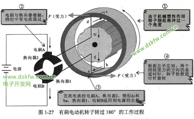 圖1-27所示為有刷電動機轉(zhuǎn)子轉(zhuǎn)過180°的工作過程。此時直流電流經(jīng)電刷A、換向器2,繞組dc和ba、換向器1、電刷B返回到電源的負極。