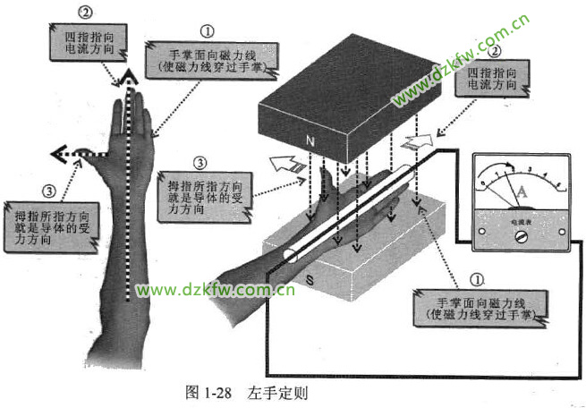 左手定則是確定通電導體在外磁場中受力方向的定刖.其判斷方法如圖1-28所示.即伸開左手,使拇指與其余四指垂直,并都與手掌在同一平面內(nèi),讓磁力線穿入手心(手心面向磁場N極),四指指向電流方向,拇指所指方向就是導體的受力方向。