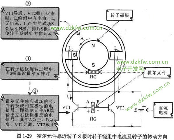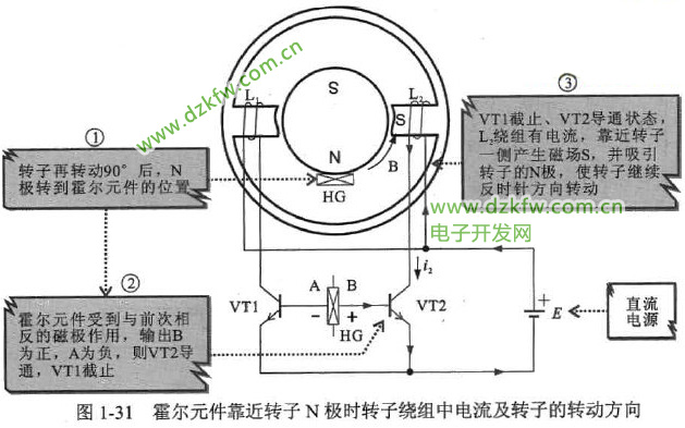 當轉(zhuǎn)子N極轉(zhuǎn)到霍爾元件的位置時,霍爾元件靠近轉(zhuǎn)子N極,此時的轉(zhuǎn)子繞組中的電流及轉(zhuǎn)子的轉(zhuǎn)動方向如圖1-31所示。此時霍爾元件受到與前次相反的磁極作用,霍爾元件的輸出B為正A為負,則VT2導通,L2中有電流,產(chǎn)生磁極為S,S極吸引轉(zhuǎn)子的N極,則轉(zhuǎn)子繼續(xù)反時針轉(zhuǎn)動,這樣就可以連續(xù)旋轉(zhuǎn)起來。