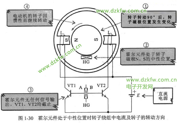 當轉(zhuǎn)子轉(zhuǎn)動90°時,霍爾元件處于中性位置,此時的轉(zhuǎn)子繞組中的電流及轉(zhuǎn)子轉(zhuǎn)動方向如圖1-30所示。此時無輸出,兩晶體三極管都截止,但電動機的轉(zhuǎn)子會因慣性而繼續(xù)轉(zhuǎn)動。