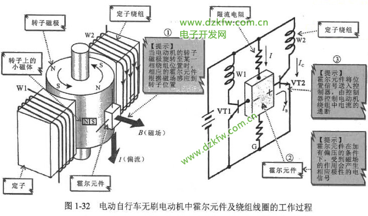 圖1-32所示為無刷電動機中霍爾元件及繞組線圈的工作過程。