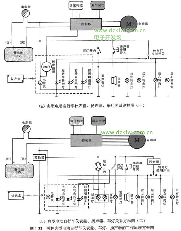 圖1-33所示為兩種典型電動自行車儀表盤、車燈、揚聲器的工作原理方框圖。