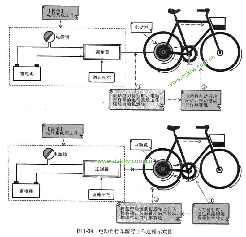 電動自行車的機械部件構成整車的動力傳動部分,電動自行車的騎行工作過程示意圖如圖1-34所示。