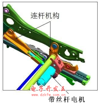 1) 蝸輪絲桿 (沒錯(cuò)又是它), 絲桿在電機(jī)上, 電機(jī)和蝸輪分別與四連桿的兩端旋轉(zhuǎn)聯(lián)接。通過蝸輪在絲桿上的直線運(yùn)動(dòng)轉(zhuǎn)化為四連桿的整體運(yùn)動(dòng),帶動(dòng)座椅上下運(yùn)動(dòng)。