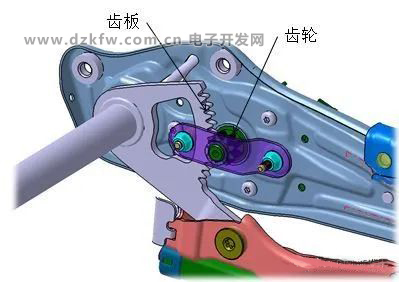 扇形齒板作為四連桿的驅(qū)動(dòng)端與(后橫梁)聯(lián)接,通過電機(jī)上的齒輪帶動(dòng)扇形齒板旋轉(zhuǎn),從而帶動(dòng)四連桿運(yùn)動(dòng),實(shí)現(xiàn)座椅升降。