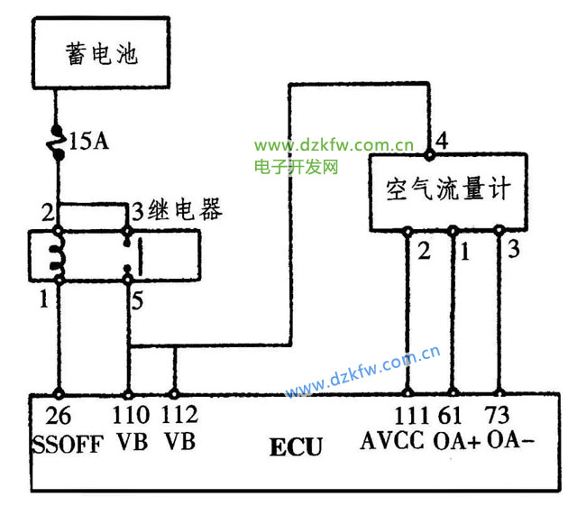 ①拆下空氣流量計,把蓄電池電壓施加于流量計端子電源與搭鐵之間,然后測量輸出端子與搭鐵之間的電壓,其標準值約為1.1~1.2V之間。
