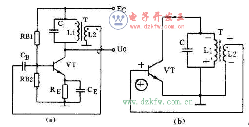 圖1(a)是變壓器反饋LC振蕩電路。晶體管VT是共發(fā)射極放大器。變壓器T的初級是起選頻作用的LC諧振電路,變壓器T的次級向放大器輸入提供正反饋信號。接通電源時,LC回路中出現(xiàn)微弱的瞬變電流,但是只有頻率和回路諧振頻率f0相同的電流才能在回路兩端產(chǎn)生較高的電壓,這個電壓通過變壓器初次級L1、L2的耦合又送回到晶體管V的基極。從圖1(b)看到,只要接法沒有錯誤,這個反饋信號電壓是和輸入信號電壓相位相同的,也就是說,它是正反饋。因此電路的振蕩迅速加強(qiáng)并最后穩(wěn)定下來。