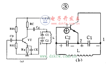 還有一種常用的振蕩電路是電容三點(diǎn)式振蕩電路,見圖3(a)。圖中電感L和電容C1、C2組成起選頻作用的諧振電路,從電容C2上取出反饋電壓加到晶體管VT的基極。從圖3(b)看到,晶體管的輸入電壓和反饋電壓同相,滿足相位平衡條件,因此電路能起振。由于電路中晶體管的3個極分別接在電容C1、C2的3個點(diǎn)上,因此被稱為電容三點(diǎn)式振蕩電路。