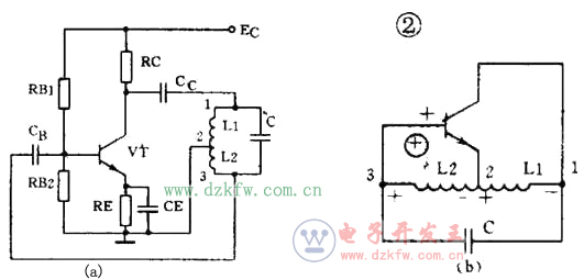 圖2(a)是另一種常用的電感三點(diǎn)式振蕩電路。圖中電感L1、L2和電容C組成起選頻作用的諧振電路。從L2上取出反饋電壓加到晶體管VT的基極。從圖2(b)看到,晶體管的輸入電壓和反饋電壓是同相的,滿足相位平衡條件的,因此電路能起振。由于晶體管的3個極是分別接在電感的3個點(diǎn)上的,因此被稱為電感三點(diǎn)式振蕩電路。