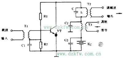 圖6是集電極調(diào)幅電路,由高頻載波振蕩器產(chǎn)生的等幅載波經(jīng)T1加到晶體管基極。低頻調(diào)制信號則通過T3耦合到集電極中。C1、C2、C3是高頻旁路電容,R1、R2是偏置電阻。集電極的LC并聯(lián)回路諧振在載波頻率上。如果把三極管的靜態(tài)工作點(diǎn)選在特性曲線的彎曲部分,三極管就是一個非線性器件。因?yàn)榫w管的集電極電流是隨著調(diào)制電壓變化的,所以集電極中的2個信號就因非線性作用而實(shí)現(xiàn)了調(diào)幅。由于LC諧振回路是調(diào)諧在載波的基頻上,因此在T2的次級就可得到調(diào)幅波輸出。