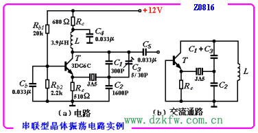串聯型晶體振蕩電路如圖Z0816(a)所示,圖(b)為它的交流等效電路,由圖(b)可知,該電路與電容三點式振蕩電路十分相似。不同的只是反饋信號不是直接接到晶體管的輸入端, 而是經過石英晶體接到晶體管的發射極與基極之間,從而實現正反饋。當調諧振蕩回路,使其振蕩頻率等于石英晶體諧振器的串聯諧振頻率fS時晶體的阻抗最小,且為純電阻,這時正反饋最強,相移為零,故滿足自激振蕩條件。對于fS以外的其它頻率,晶體的阻抗增大,相移也不為零,不滿足自激振蕩條件,因此振蕩頻率等于晶體的串聯諧振頻率fS。由于晶體的固有頻率與溫度有關,所以在特定的場合下,將采用溫度補償電路或將石英晶體置于恒溫槽中,以達到更高頻率穩定度的要求。