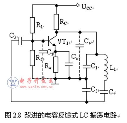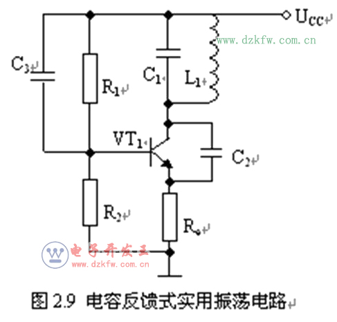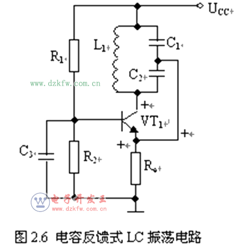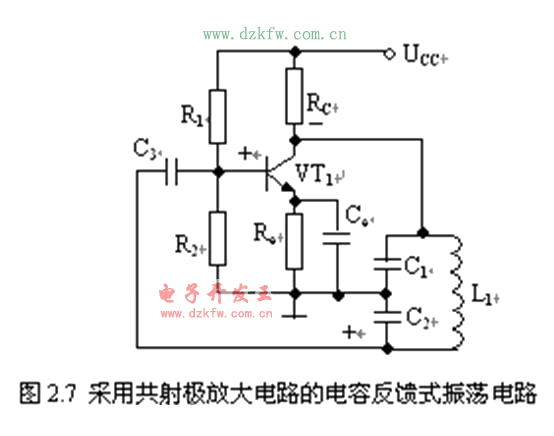 VT1屬共基極放大電路, LC諧振回路兩個串聯電容C1、C2接晶體管的三個極。