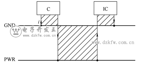 印制電路板上的電源平面和地平面之間、集成電路旁邊經常接濾波電容器,以抑制器件驅動時產生的電壓脈動,電容器的電荷釋放受到電感的限制。