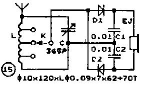 12、收聽(tīng)短波的電路,但天線(xiàn)要加長(zhǎng)到50米,機(jī)內(nèi)連線(xiàn)加粗到Φ2mm。可變電容是串聯(lián)的,線(xiàn)圈L1套入L2調(diào)節(jié)。180PF可變電容為360PF雙連拆去其中一聯(lián)動(dòng)片得到。