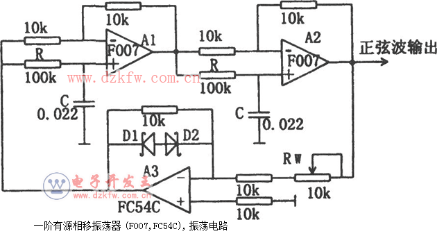 如圖所示為一階有源相移振蕩電路。該電路中,A1和A2組成一階有源移相器,并與A3構成環路。A3為反相比例放大器,起主放大作用,其增益調節為-l,相移為π。D1、D2為穩壓管2DW7C,起穩幅作用。根據振蕩所需滿足的條件,一階有源移相器的傳輸系數|β|=1,總相移為π時電路可產生振蕩,其振蕩頻率為:f0=1/2πRC。