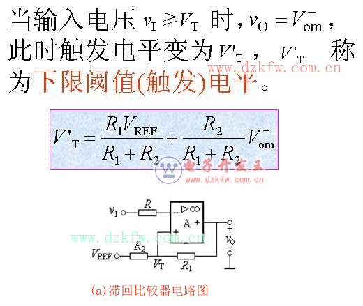 從輸出引一個電阻分壓支路到同相輸入端,電路如圖14.03(a)所示。當輸入電壓vI從零逐漸增大,且滯回比較器電路稱為上限閾值(觸發)電平。