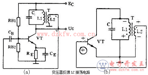 下圖(a)是變壓器反饋LC振蕩電路。晶體管VT是共發(fā)射極放大器。變壓器T的初級是起選頻作用的LC諧振電路,變壓器T的次級向放大器輸入提供正反饋信號。接通電源時,LC回路中出現(xiàn)微弱的瞬變電流,但是只有頻率和回路諧振頻率f0相同的電流才能在回路兩端產(chǎn)生較高的電壓,這個電壓通過變壓器初次級L1、L2的耦合又送回到晶體管V的基極。從下圖(b)看到,只要接法沒有錯誤,這個反饋信號電壓是和輸入信號電壓相位相同的,也就是說,它是正反饋。因此電路的振蕩迅速加強并最后穩(wěn)定下來。