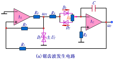 調整R1和R2的阻值可以改變鋸齒波的幅值;調整R1、R2和Rw的阻值以及C的容量,可以改變振蕩頻率;調整電位器滑動端的位置,可以改變uO1的占空比,以及鋸齒波上升和下降的斜率。