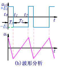 ◆當uO1=-UZ時,D2導通,D1截止,輸出電壓uO隨時間線性上升。