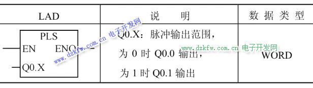 在PLC的指定輸出點(Q0.0~Q0.1,Q0.3)上實現脈沖輸出(PTO)和脈寬調制(PWM)功能。CPU ST20具備配有兩個PTO/PWM發生器,它們可以產生一個高速脈沖串或者一個脈沖調制波形。當Q0.0和 Q0.1作為高速輸出點時,其普通輸出點被禁用,而當不作為PTO/PWM發生器時,Q0.0和 Q0.1可作為普通輸出點使用。一般情況下,PTO/PWM輸出負載至少為10%的額定負載。脈沖輸出指令(PLS)配合特殊存儲器用于配置高速輸出功能,PLS指令格式見下表。