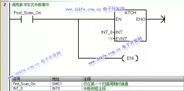 ②PTO狀態字中的空閑位(SM66.7或者SM76.7)標志著脈沖輸出完成。另外,在脈沖串輸出完成時,可以執行一段中斷服務程序。如果使用多段操作時,可以在整個包絡表完成后執行中斷服務程序。