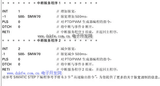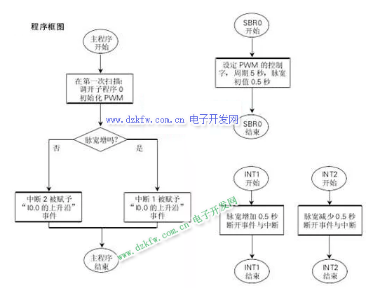 每個周期中斷程序1將當前脈寬增加0.5秒,然后利用D丁C日指令分離中斷INT1,使這個中斷再次被屏蔽。如果在下次增加時,脈寬大于或等于周期,則將輔助內存標記位M 0.0再次置0。這樣就把中斷程序2賦子事件0,并且脈寬也將每次遞減0.5秒。當脈寬值減為零時,將再次執行,初始化程序(子程序0)。