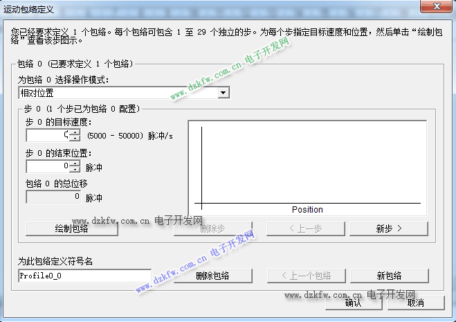 該界面要求設定操作模式、1個步的目標速度、結束位置等步的指標,以及定義這一包絡的符號名。(從第0個包絡第0步開始)。在操作模式選項中選擇相對位置控制,填寫包絡“0”中數據目標速度“60000”,結束位置“85600”,點擊“繪制包絡”,如圖9所示,注意,這個包絡只有1步。包絡的符號名按默認定義。這樣,第0個包絡的設置,即從供料站→加工站的運動包絡設置就完成了。現在可以設置下一個包絡。
