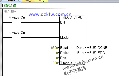 “模式”(Mode) 輸入的值用于選擇通信協議。輸入值為 1 時,將 CPU 端口分配給 Modbus 協議并啟用該協議。輸入值為 0 時,將 CPU 端口分配給 PPI 系統協議并禁用 Modbus 協議。