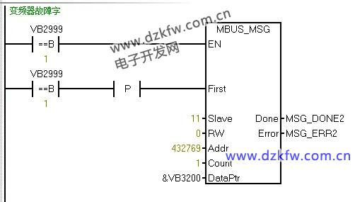 Slave=11代表從站設備的通訊ID為11;RW=0代表只讀;Addr=432769代表從站設備的modbus寄存器地址;count=1代表一個字。DataPtr(間接地址指針)=&VB3200代表從VB3200開始。一個字就是VW3200。