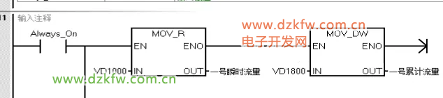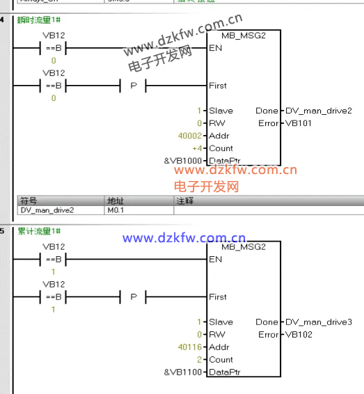 瞬時(shí)流量的地址是40002,正向累計(jì)流量地址是40116,分別存放在VB1000開始的地址和VB1100開始的地址內(nèi)。